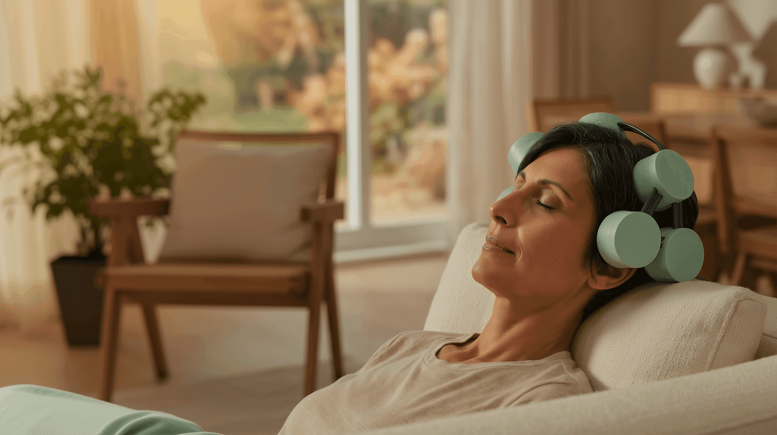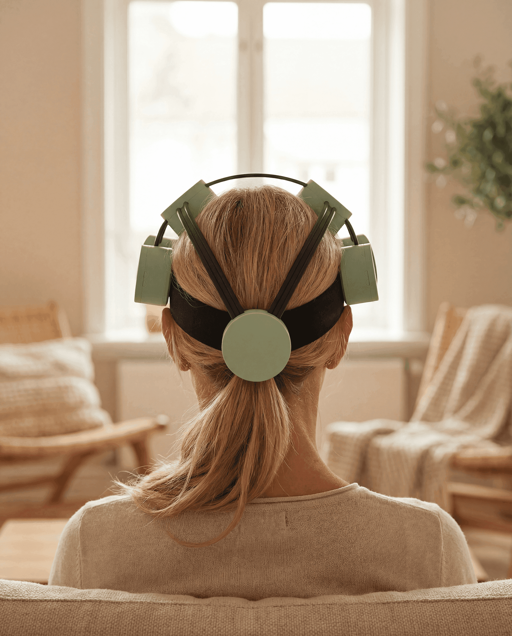 A 7-coil electromagnetic headset applied over the scalp. No electrode contact. 30-minute daily sessions at home.